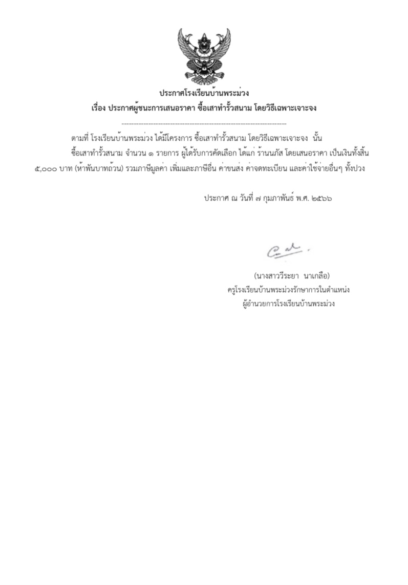 ประกาศผู้ชนะการเสนอราคา ซื้อเสาทำรั้วสนาม โดยวิธีเฉพาะเจาะจง