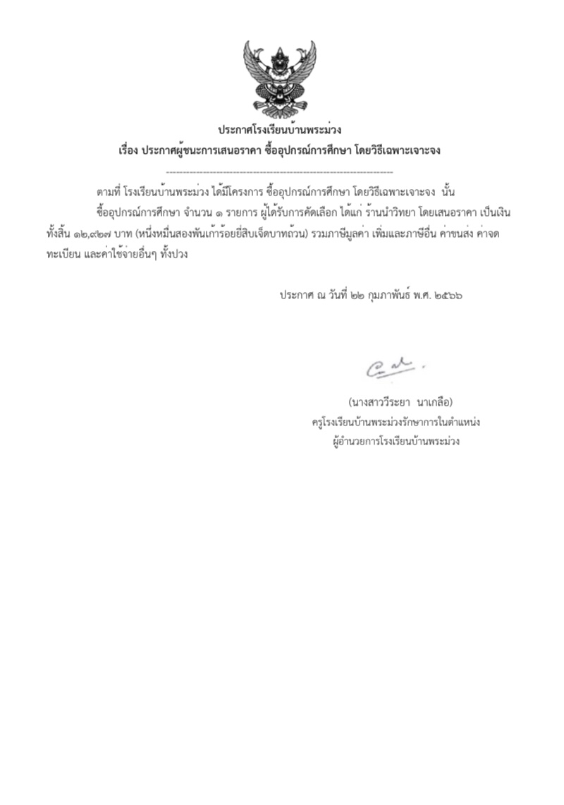 ประกาศผู้ชนะการเสนอราคา ซื้ออุปกรณ์การศึกษา โดยวิธีเฉพาะเจาะจง