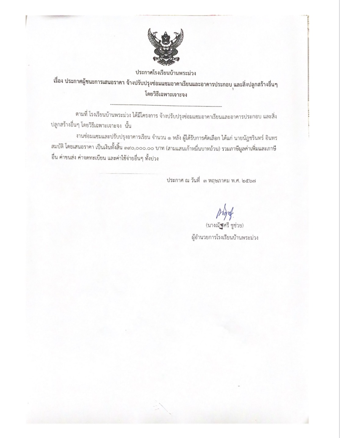 ประกาศผู้ชนะการเสนอราคา จ้างปรับปรุงซ่อมแซมอาคารเรียนและอาคารประกอบ และสิ่งปลูกสร้างอื่นๆ โดยวิธีเฉพาะเจาะจง