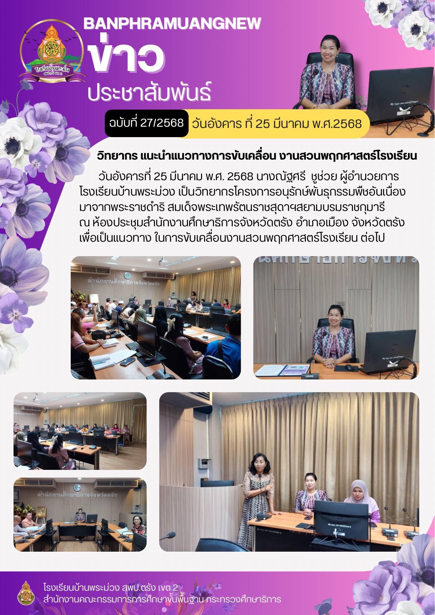 ผู้อำนวยการโรงเรียนบ้านพระม่วง เป็นวิทยากรโครงการอนุรักษ์พันธุกรรมพืชอันเนื่องมาจากพระราชดำริ สมเด็จพระเทพรัตนราชสุดาฯสยามบรมราชกุมารี ณ ห้องประชุมสำนักงานศึกษาธิการจังหวัดตรัง